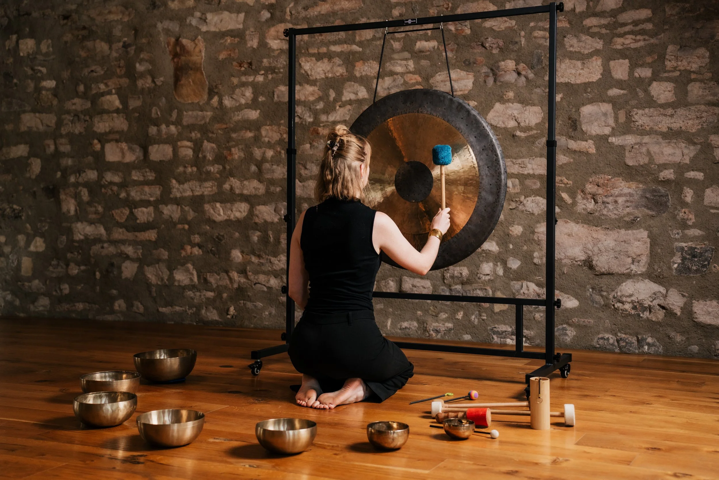 Ein gemeinsames Klangbad mit Gong, Koshi und Klangschalen, das einen Raum für Regeneration, Loslassen und innere Ruhe schafft. -